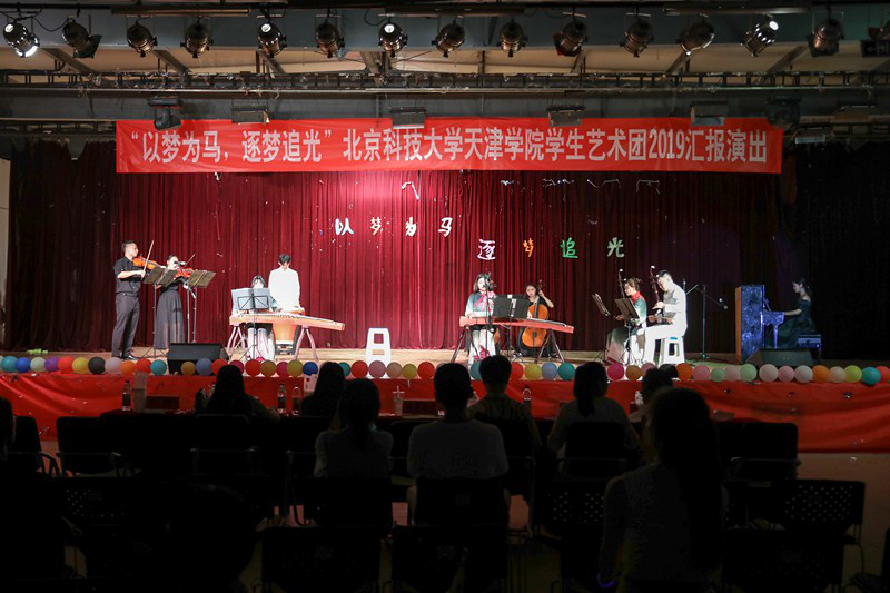 6月12日晚7點,北京科技大學天津?qū)W院學生藝術(shù)團成功舉辦“以夢為馬,逐夢追光”匯報演出。演出當晚,蒞臨本次匯報演出的嘉賓有藝術(shù)學院黨總支書記、副院長、藝術(shù)教育中心主任林碧蕓,藝術(shù)教育中心常務副主任、學生藝術(shù)團團長韓程羽,外語系黨總支副書記、宣傳部副部長張?zhí)砩疲瑢W生藝術(shù)團民樂團指導教師、藝術(shù)系作曲與基礎(chǔ)理論教研室主任陳倩,學生藝術(shù)團管弦樂團指導教師、藝術(shù)系分團委書記張悅,學生藝術(shù)團國禮主戲指導教師盛鑫娜以及學院各社團優(yōu)秀干部和學生藝術(shù)團全體成員,與我們共同觀看了本次匯報演出。