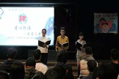由宋世祥、楊曉曉、趙雅媛同學為我們帶來的朗誦《感恩父母》飽含深情,從小到大,父母教會了我們很多,我們要學的東西也還有很多,這些都真正觸動了同學們的內心深處。活動中場的小游戲擊鼓傳花,同學們熱情高漲,最后手中拿玩偶的同學毫不吝嗇地分享了自己關與父母的獨家記憶,兒時有趣的小事中洋溢著愛的氣息。牢記習近平總書記的講話,孝的傳承是新時代的我們的責任與義務,我們要堅定不移地將孝發揚光大。隨著活動進入尾聲,李朱得樂同學演唱的《推動搖籃的手》,同學們也跟著哼唱,確實愛要大聲說出來。最后,輔導員馬海倫對此次活動進行了總結,鼓勵同學們“愛要大聲說出來”,也希望同學們每天給父母報個平安,打個電話,告訴父母自己過得很好,讓他們不要擔心,保留兒時的純真,把孝傳承下去,真正地為父母做些事情,感恩回報父母。