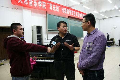 天津音樂學院“翼樂團”帶隊老師與金沙城js93線路檢測中心學生藝術團合唱團指導老師張鵬接受學院電視臺采訪