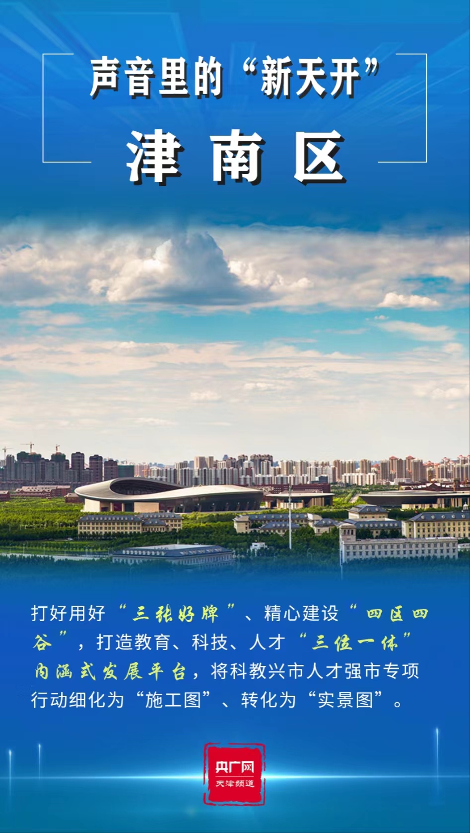 央廣網天津5月12日消息 2023年是全面貫徹黨的二十大精神的開局之年。寅末卯初,天津市委經濟工作會議召開,高站位、高標準謀劃“十項行動”,逐步將黨的二十大擘畫的宏偉藍圖推向實景。其中,一個響亮的名字——“天開高教科創園”(以下簡稱“天開園”)引發廣泛關注。“天開”,既融合了南開大學、天津大學兩所百年名校,亦有得天獨厚、開拓進取等寓意,為人們帶來無限想象空間,可謂石破“天開”。