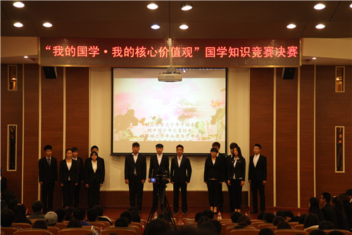 11月18日晚7點,“我的國學?我的價值觀”國學知識競賽在理工館學術報告廳正式拉開帷幕。團委書記羅富臣、外語系黨總支書記何紅升、團委副書記殷實,田勇、圖書館讀者咨詢部主任王妙麗、團委各部部長、分團委書記及二百多名學生參加此次活動。決賽分為五輪答題,分別為團隊必答題、個人必答題、60秒快速問答題、觀眾互動答題和兩輪風險題,答題結束后,如出現同分隊伍則進行附加賽。比賽正式開始前,孝心社孫燁同學做“我的國學?我的價值觀”主題演講,詮釋了國學與核心價值觀之間的緊密聯系。必答題環節開始后,參賽隊員略顯緊張,但很快就進入了比賽節奏,四支參賽隊伍表現都十分優異,必答題結束后,院學生會泓涵隊以微弱優勢領先。之后,由廣播站和孝心社13名同學朗誦《少年中國說》,“少年智則中國智,少年強則中國強”,慷慨激昂的聲音在報告廳久久回響,激勵了同學們立志成才、報效祖國,現場時時爆發雷鳴般的掌聲。60秒快速問答環節,現場觀眾屏息凝神,在最后一支隊伍答題完畢后,現場爆發了熱烈的掌聲,觀眾無不為主持人的反應敏捷和答題選手的博學多才所折服。快速問答環節結束后,院學生會泓涵隊的領先優勢繼續擴大。觀眾答題環節,主持人與觀眾的互動稍稍緩解比賽的緊張氣氛。而緊張刺激風險題環節,把整個活動推向高潮,現場時時爆發熱烈的掌聲為回答正確的同學祝賀,也為答錯扣分的隊伍扼腕嘆息。兩輪風險題結束后,學生藝術團民樂團的三名同學為觀眾獻上古箏彈奏《漢江韻》,熱烈歡快的曲調讓同學們深深體會了中華傳統文化的魅力。