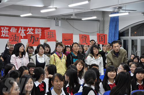 在答辯現(xiàn)場,各班的“啦啦隊”以各種方式為班級加油。他們手拉班級條幅、齊聲高喊班級口號,為上臺答辯的同學(xué)加油鼓勁,充分展示了班級的凝聚力。整個答辯現(xiàn)場洋溢著輕松愉快的氣氛。