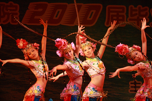 晚會以“云水約定”為主題,分為“云水記憶”和“約定未來”兩個篇章。本次畢業生文藝晚會舞臺設計新穎,在主舞臺前方延伸出正方形副舞臺,在副舞臺兩側還安排2010屆畢業生觀眾,加強了表演者與觀眾的交流。隨著管弦樂合奏的徐徐響起,晚會正式拉開帷幕。激情昂揚的《加勒比序曲》,節奏歡快的《五聲神韻》,將現場觀眾的熱情充分調動起來。熱烈的掌聲中,我們迎來了晚會的第一個節目歌伴舞《美麗的草原我的家》。演唱者行云流水般的歌聲,讓人感覺仿佛置身于草原之中,體驗著那份清新與自然,享受草原的寧靜。接下來是由學生藝術團帶來的舞蹈《俏花旦》,它以中國傳統方式京劇為淵源,用不同于京劇表演的全新方式演繹而來。表演者動作靈活敏捷,宛如一個個舞動的精靈。