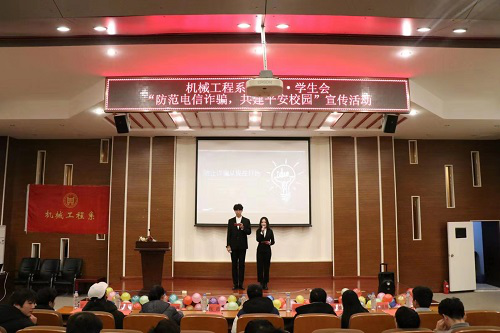 為維護我們安靜的學習環境,提高防范意識,使同學們在平時的生活中遠離詐騙分子,圓滿的完成自己的學業,機械工程系于12月1日下午5點在理工圖書館學術報告廳舉辦了以“防范電信詐騙,共建平安校園”的情景劇活動。此次活動到場的有機械工程系分團委書記張軍老師、材料系19級輔導員韓子玉老師以及機械系分團委、學生會主席團和部長團成員。