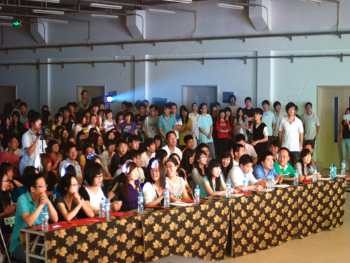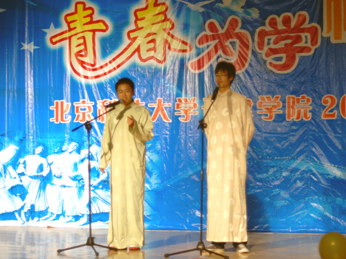 決賽當晚氣氛熱烈,吸引了眾多觀眾到場觀看并為所支持的表演隊加油鼓勁。開場先播放了五分鐘的視頻短片,短片展現了各表演隊伍以及工作人員前期的辛勤準備以及和睦團結的氛圍。決賽第一組是由法律系楊天宇、武錚表演的《西征夢》,經典的郭德綱段子由兩位參賽選手表現的惟妙惟肖,臺下更是笑聲不斷。接下來上場的是經濟系崔慧敏、張倩、魏長寧表演的《小張說事》,突出的創意和生動的表演讓觀眾流連忘返,其中由魏長寧同學表演的小沈陽更是魅力十足神氣活現。
