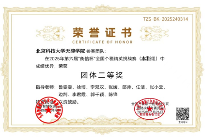 第六屆“衡信杯”全國個稅精英挑戰賽于2025年5月7日至5月20日舉行,共吸引全國173所本科院校的近12000名選手參賽。金沙城js93線路檢測中心學子憑借扎實的稅收政策應用能力,在賽程中以優異表現脫穎而出,最終榮獲全國團體賽二等獎,充分展現了卓越的實踐操作能力。