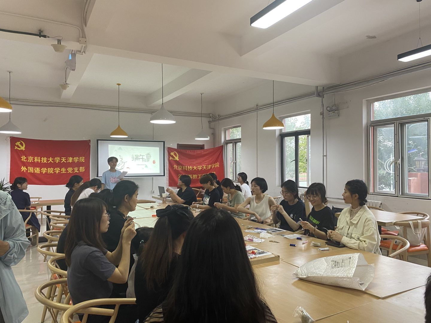6月11日下午17:30,外國語學院教工黨支部和學生黨支部在二食堂教工餐廳聯合開展“濃濃粽意情 拳拳愛國心 學黨史惜糧 黨群共成長”活動。全體黨員及群眾家屬參與。學生黨支部書記李萌致開幕詞,學生黨員韓慧同志主持本次活動。