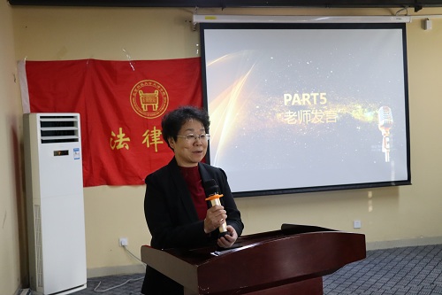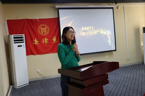 王蘭萍老師發(fā)言。她對(duì)通過法考的同學(xué)們表示祝賀,勉勵(lì)法律系2016級(jí)學(xué)子繼續(xù)努力,為同學(xué)們樹立榜樣,多分享經(jīng)驗(yàn)。希望同學(xué)們好好學(xué)習(xí),天天向上。