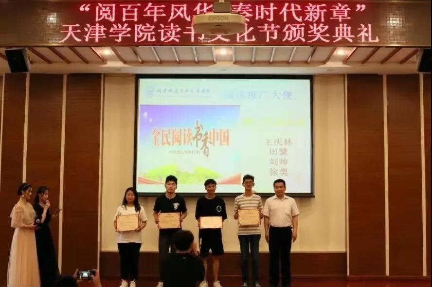 圖書館聯手外國語學院在理工館學術報告廳舉辦了“閱百年風華 奏時代新章”為主題的天津學院讀書文化節頒獎典禮。在本屆讀書文化節中,師生讀者參與度高,在所營建的書香文化氛圍中受到了熏陶。同時對獲獎同學的表彰,為其他的同學樹立了良好的榜樣,培養同學們閱讀的好習慣,進一步激發了同學們的閱讀和學習熱情,在推進文明和諧校園的建設之路上又邁出了新的一步。