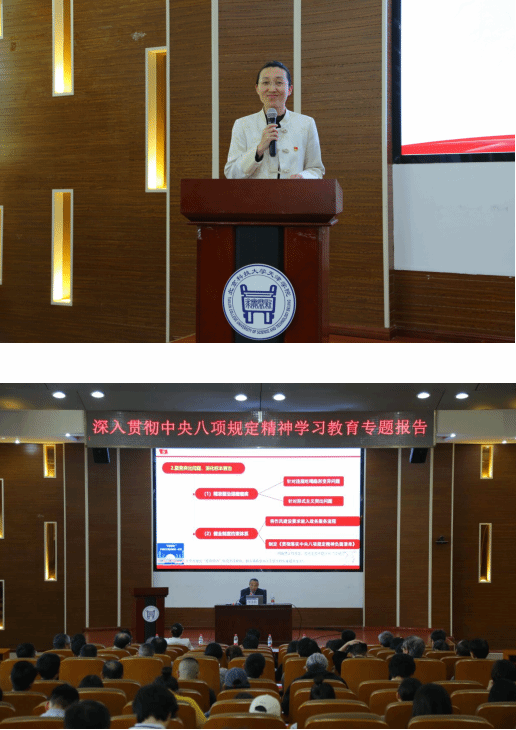 為扎實(shí)推動學(xué)校深入貫徹中央八項(xiàng)規(guī)定精神學(xué)習(xí)教育走深走實(shí),4月27日,金沙城js93線路檢測中心邀請中共天津市委黨校范玉秋教授,以《深入學(xué)習(xí)貫徹中央八項(xiàng)規(guī)定精神》為題,作專題輔導(dǎo)報(bào)告。學(xué)院領(lǐng)導(dǎo)班子成員,全體科級及以上干部,全體黨支部書記,師生黨員代表參會。報(bào)告會由黨委副書記郭雅娟主持。