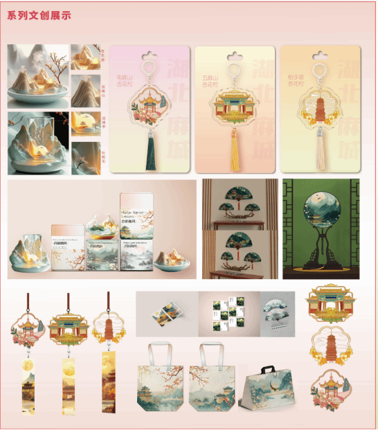 該賽項自2024年10月份報名開始,藝術(shù)學(xué)院師生積極組隊參賽,歷時6個多月,歷經(jīng)作品技術(shù)審查、初審、決賽評審及答辯環(huán)節(jié),由師生齊心協(xié)力完成作品《杏韻春風(fēng)系列文創(chuàng)集》。該系列作品以湖北麻城杏花村及周邊特色景點為靈感來源,融合了杏花村的文化元素與自然風(fēng)光進(jìn)行創(chuàng)作和設(shè)計。