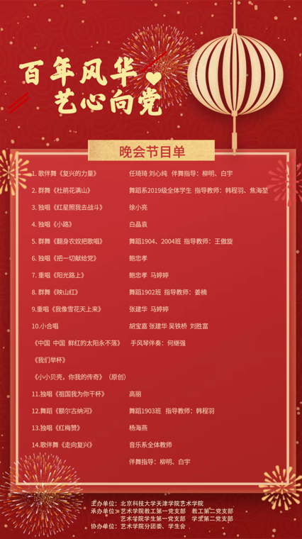 百年征程波瀾壯闊,百年初心歷久彌堅(jiān)。6月9日晚19:00,慶祝中國(guó)共產(chǎn)黨成立100周年——北京科技大學(xué)天津?qū)W院"百年風(fēng)華,藝心向黨"主題晚會(huì)在體育館隆重舉行。北京科技大學(xué)天津?qū)W院院長(zhǎng)王斌,黨委副書(shū)記牛犁,財(cái)務(wù)總監(jiān)...