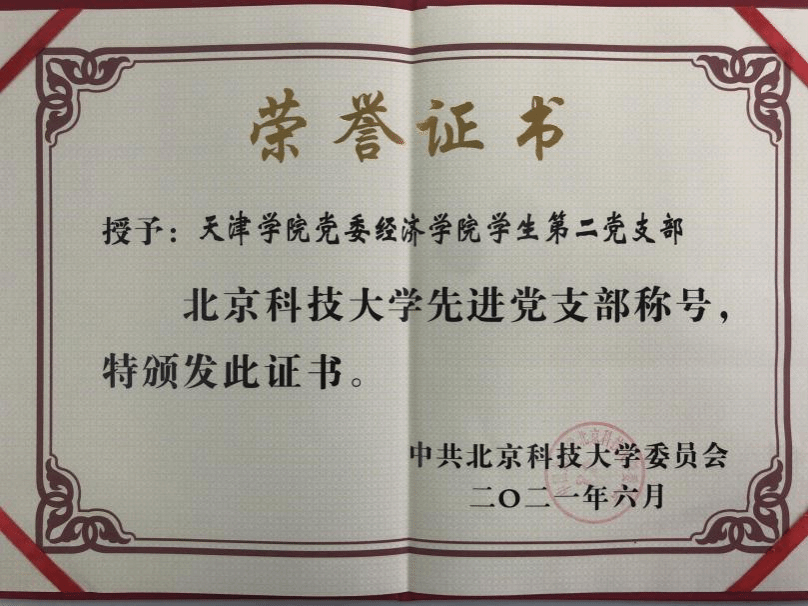 在黨的百歲誕辰之際,2021年6月30日,北京科技大學(xué)隆重召開(kāi)“兩優(yōu)一先”表彰大會(huì),北京科技大學(xué)天津?qū)W院經(jīng)濟(jì)學(xué)院學(xué)生第二黨支部榮獲“先進(jìn)黨支部”榮譽(yù)稱(chēng)號(hào)。 百年恰是風(fēng)華正茂,正值中國(guó)共產(chǎn)黨成立100周年,經(jīng)濟(jì)學(xué)...
