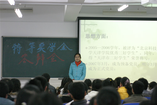 11月20日晚,北京科技大學(xué)天津?qū)W院05、06級特等獎學(xué)金答辯會分別在8教102、103室舉行。法律系副主任于圣維副教授、教育技術(shù)中心畢會英副教授、經(jīng)濟系黨總支書記范麗麗、管理系黨總支書記張恩惠、信息系黨總支書記柯瑜...