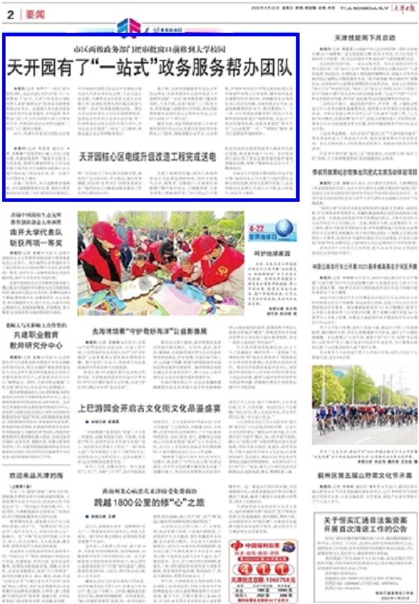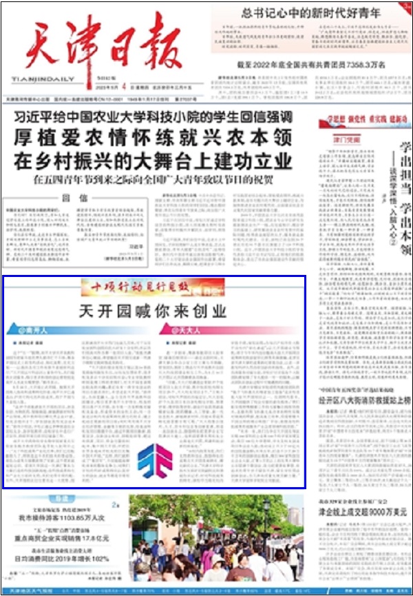《天津日報》 2023 年 5 月 4 日 01 版 進一步招商、籌備首批項目入駐事宜、儲備后續(xù)項目……最近這段時間,天津大學(xué)合作辦公室主任王寒馬不停蹄,帶領(lǐng)團隊倒排工期進行天開高教科創(chuàng)園天大科技園建設(shè)相關(guān)工作,為5月...